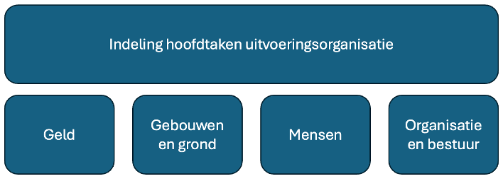 De hoofdtaken van de uitvoeringsorganisatie worden – in analogie aan de indeling die VKB Kerkrentmeesters maakt – ingedeeld in vier werkgebieden.